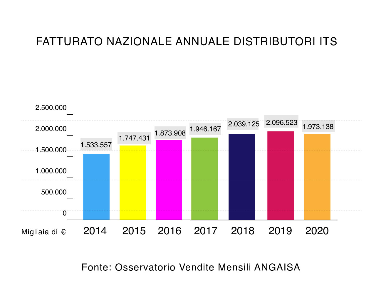 Secondo i dati elaborati dall’associazione di categoria dei distributori ITS italiani, i fatturati del comparto sono cresciuti costantemente dal 2014 al 2019, prima dello stop causato dall’emergenza sanitaria nel 2020 (clicca sulla tabella in basso per ingrandirla).